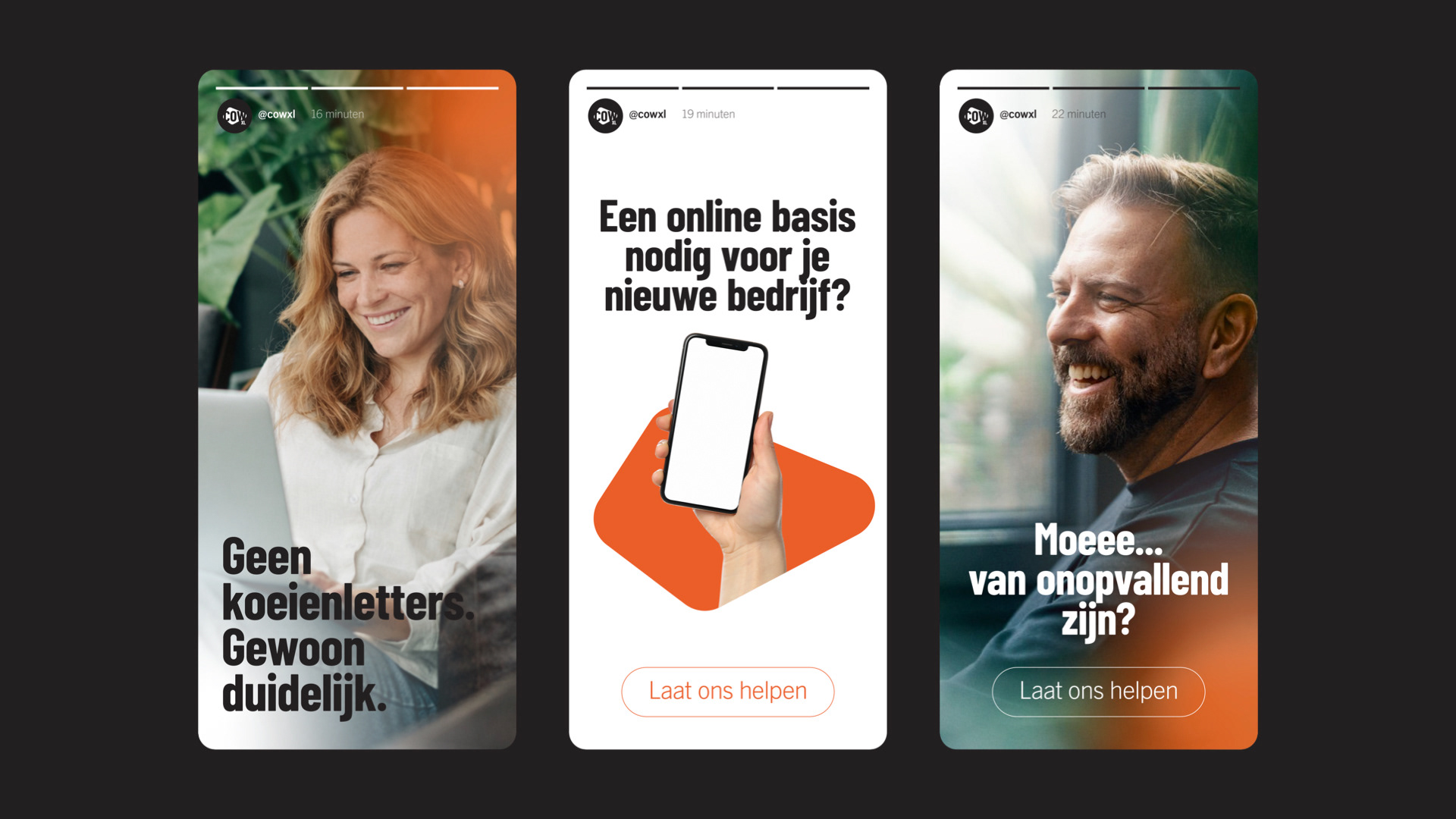 In de merkcommunicatie is gekozen voor een toegankelijke en herkenbare tone of voice waarin subtiele woordspelingen rond het thema “koe” worden ingezet, zoals “Geen koeienletters, gewoon duidelijk” en “Moe van onzichtbaar zijn?”. Deze speelse insteek sluit aan bij de nuchtere, toegankelijke en gelijkwaardige houding van het merk, terwijl de visuele stijl professioneel en rustig blijft. Zo ontstaat een identiteit die zowel persoonlijk als professioneel aanvoelt en aansluit bij de belevingswereld van de doelgroep.